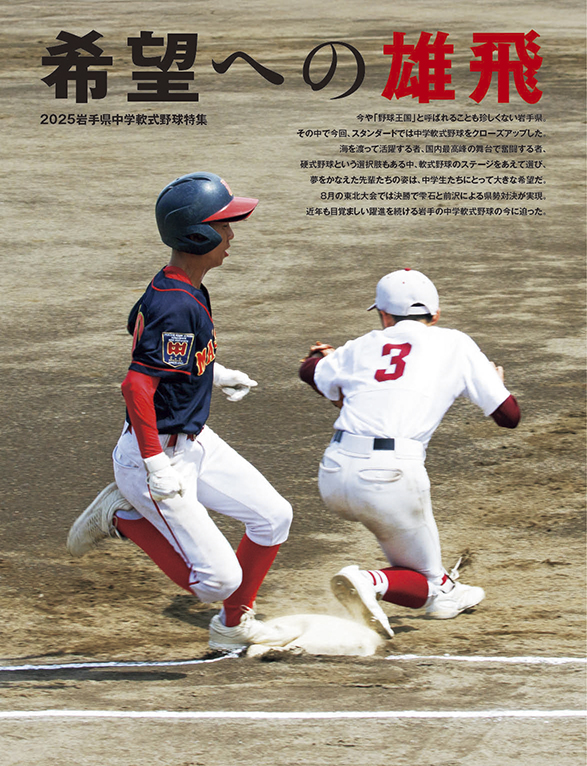 今や「野球王国」と呼ばれることも珍しくない岩手県。海を渡って活躍する者、国内最高峰の舞台で奮闘する者、硬式野球という選択肢もある中で、軟式野球というステージを選び、夢をかなえた先輩たちの姿は大きな希望です。県中総体は決勝で敗れたものの、東北大会でリベンジした雫石中学校、県中総体を2年ぶりに制し、東北大会でも決勝に進出、全国大会でも初勝利を収めた前沢中学校を取り上げます。選手名鑑は82チームを紹介します。