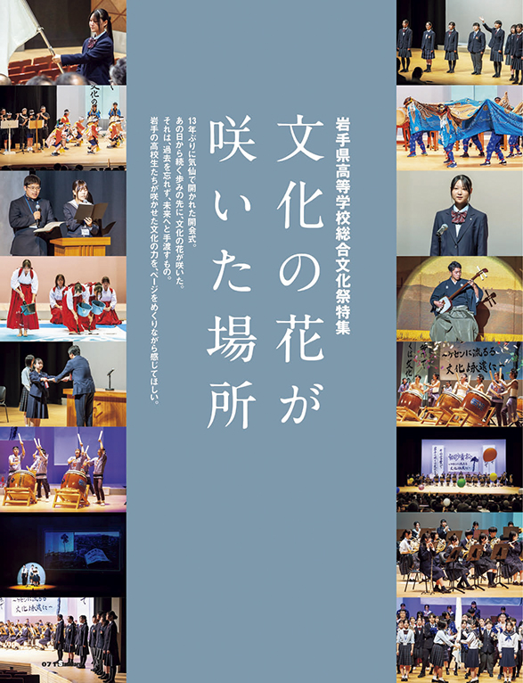 13年ぶりに気仙地区で開催された高文祭総合開会式。あの日から続く歩みの先に、文化の花が咲きました。それは過去を忘れず、未来へ手渡すもの。岩手の高校生たちが咲かせた文化の力を、本記事から感じてください。今号では、合唱、軽音楽、吹奏楽、マーチングバンド、バトントワリング、写真、国際理解、英語、囲碁についてのリポートと結果を掲載します。
